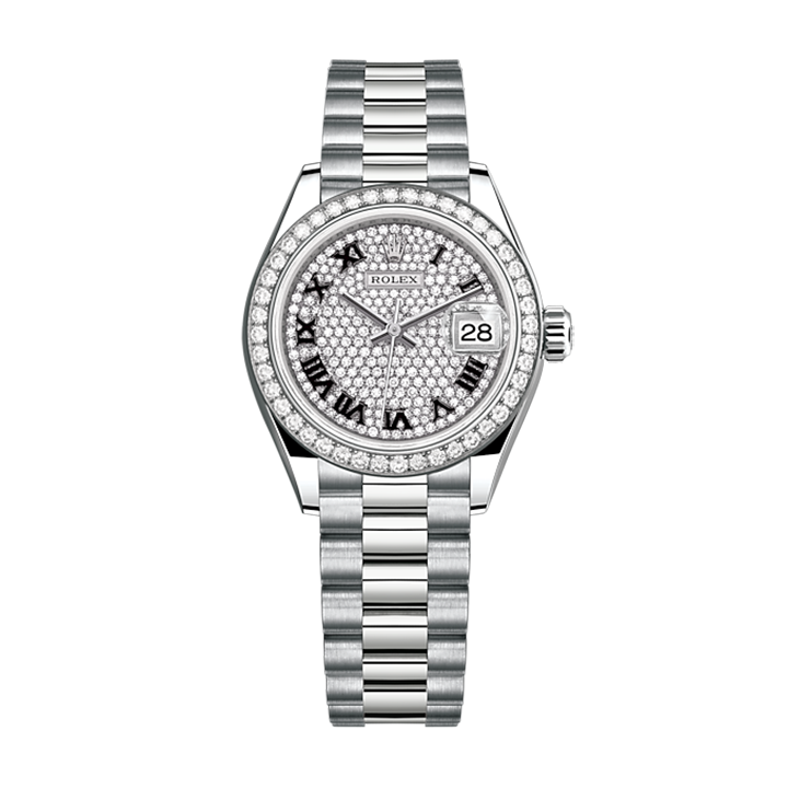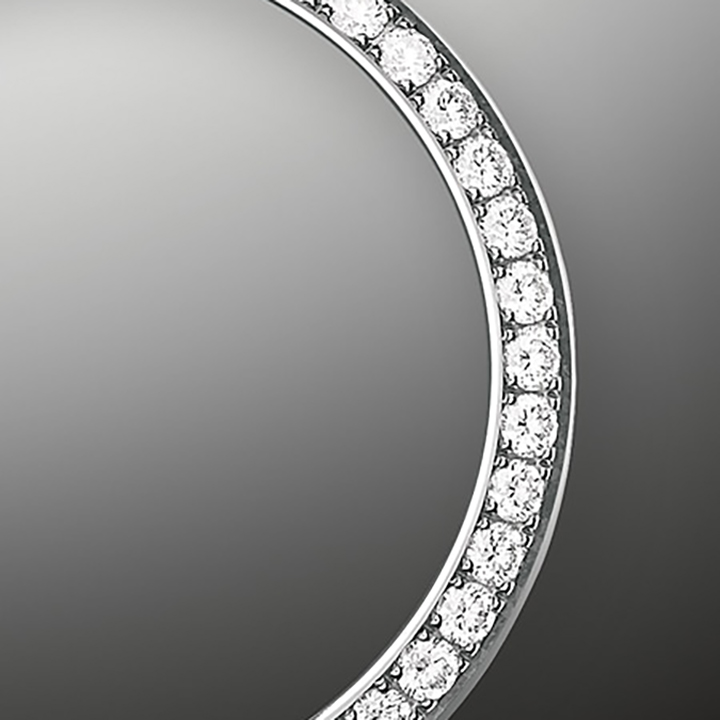The light reflections on the case sides and lugs highlight the elegant profile of the 28 mm Oyster case, which is fitted with a diamond-set bezel. Rolex's classic feminine watch, the Lady-Datejust is in the lineage of the Datejust, the emblematic model that has been a byword for style and accurate timekeeping.