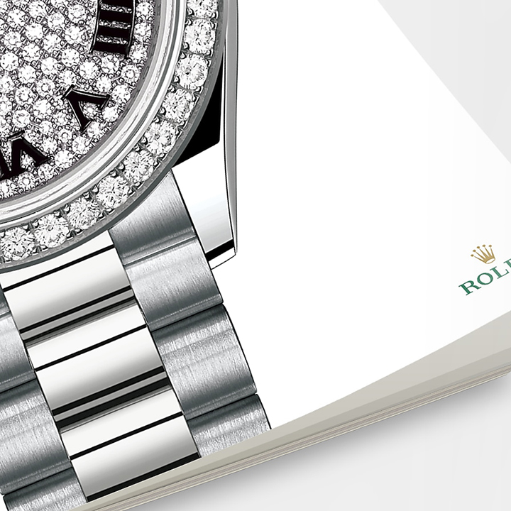 THIS OYSTER PERPETUAL LADY-DATEJUST IN 18 CT WHITE GOLD FEATURES A DIAMOND-PAVED DIAL AND A PRESIDENT BRACELET.