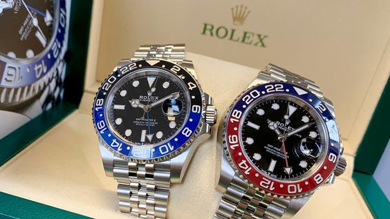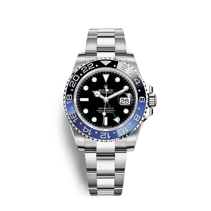 This model features a black dial and a two-colour Cerachrom bezel insert in red and blue ceramic. Designed to show the time in two different time zones simultaneously during intercontinental flights, the GMT-Master II has come to be recognized for its robustness and versatile appearance.