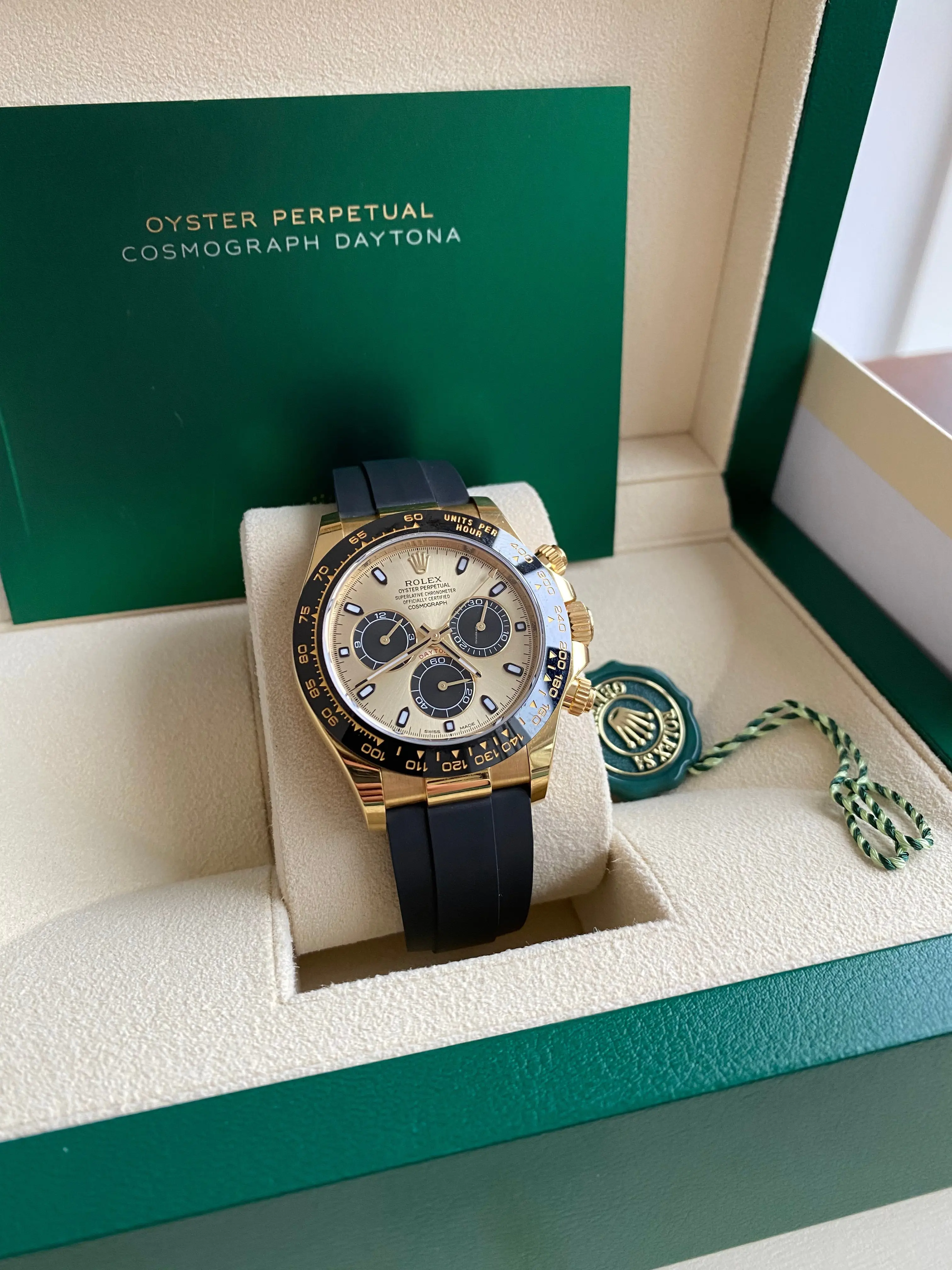 THIS OYSTER PERPETUAL COSMOGRAPH DAYTONA IN 18 CT YELLOW GOLD WITH A BLACK DIAL AND AN OYSTERFLEX BRACELET, FEATURES A BLACK CERACHROM BEZEL WITH TACHYMETRIC SCALE.