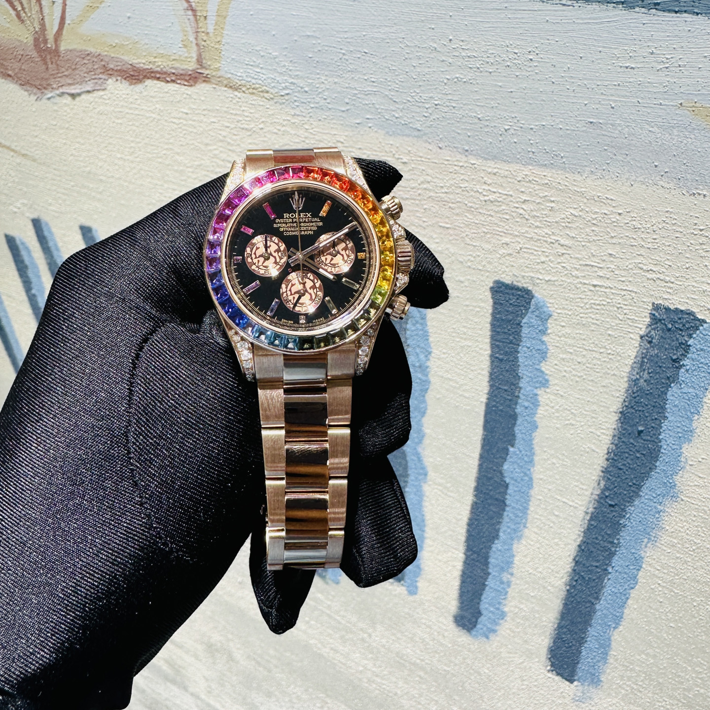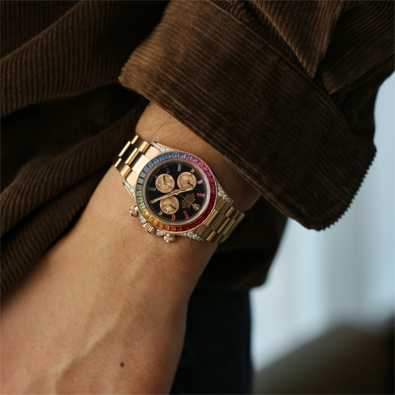 With the street cred of a Rapper’s bling, the Rolex Daytona ‘Rainbow’ is quite possibly the most in demand precious metal Daytona in production today.