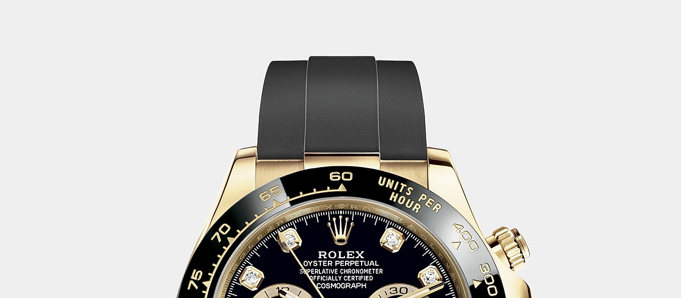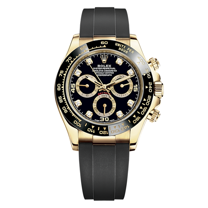 THIS OYSTER PERPETUAL COSMOGRAPH DAYTONA IN 18 CT YELLOW GOLD WITH A BLACK, DIAMOND-SET DIAL AND AN OYSTERFLEX BRACELET, FEATURES A BLACK CERACHROM BEZEL WITH TACHYMETRIC SCALE.