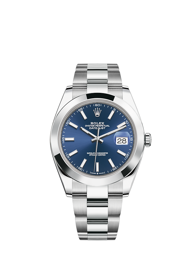 THIS OYSTER PERPETUAL DATEJUST 41 IN OYSTERSTEEL FEATURES A BRIGHT BLUE DIAL AND AN OYSTER BRACELET.