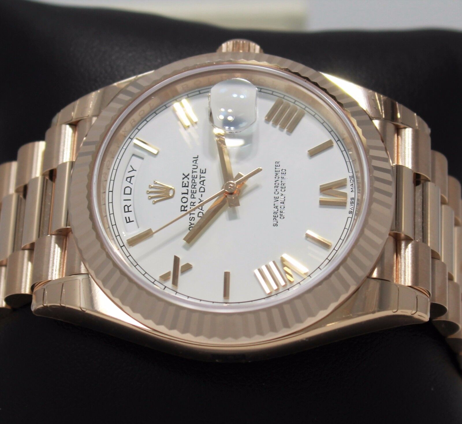 THE OYSTER PERPETUAL DAY-DATE 40 IN 18 CT EVEROSE GOLD WITH A CHOCOLATE DIAL, FLUTED BEZEL AND A PRESIDENT BRACELET.