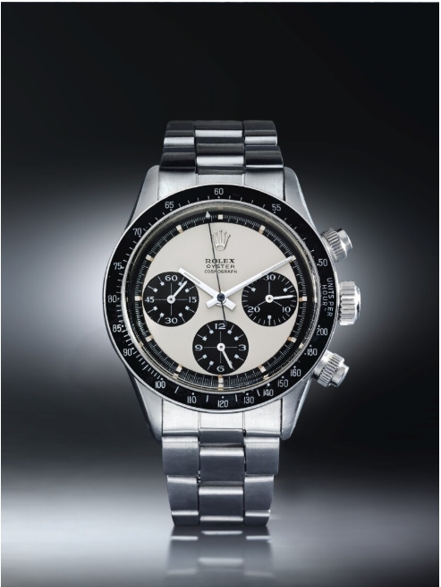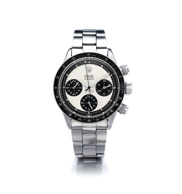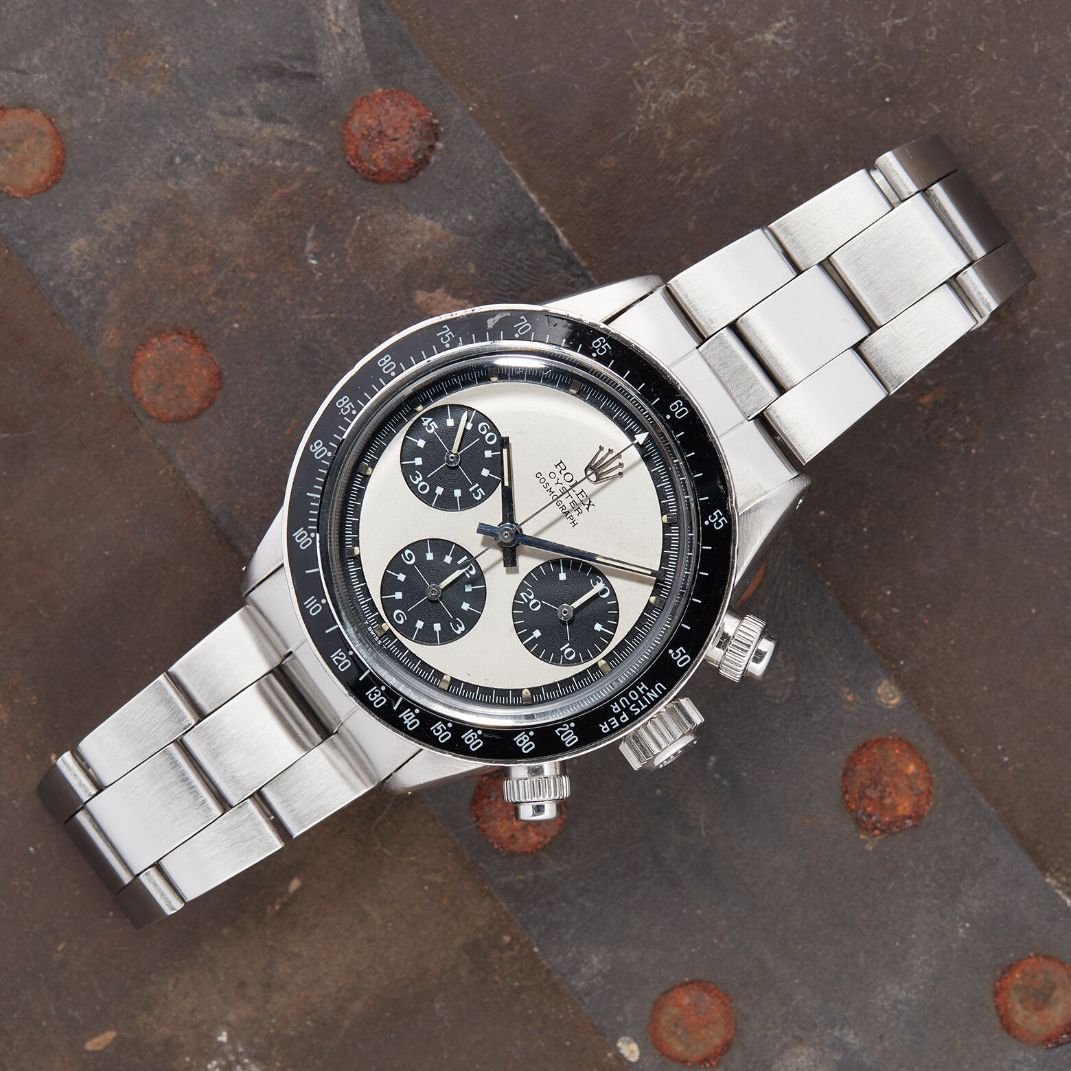 This example of reference 6263, however, is further graced by the incredibly rare and attractive “Panda” version of the famed white Paul Newman dial. That is, a white Paul Newman dial that displays only two colors: black and white, without red track or red Daytona designation. In its simplicity, the Panda dial achieves a momentous aesthetic result, especially when mounted on a 6263: the simple and stylish alternation of black and white overflows the boundaries of the dial and is reprised by the black bezel and steel case. Many Rolex collectors consider the Panda 6263 as one of the most eye-pleasing “standard production” Daytonas ever made. Combining screw down pushers and a Panda dial, the present timepiece is a horologic treasure as rare as it is enthralling.