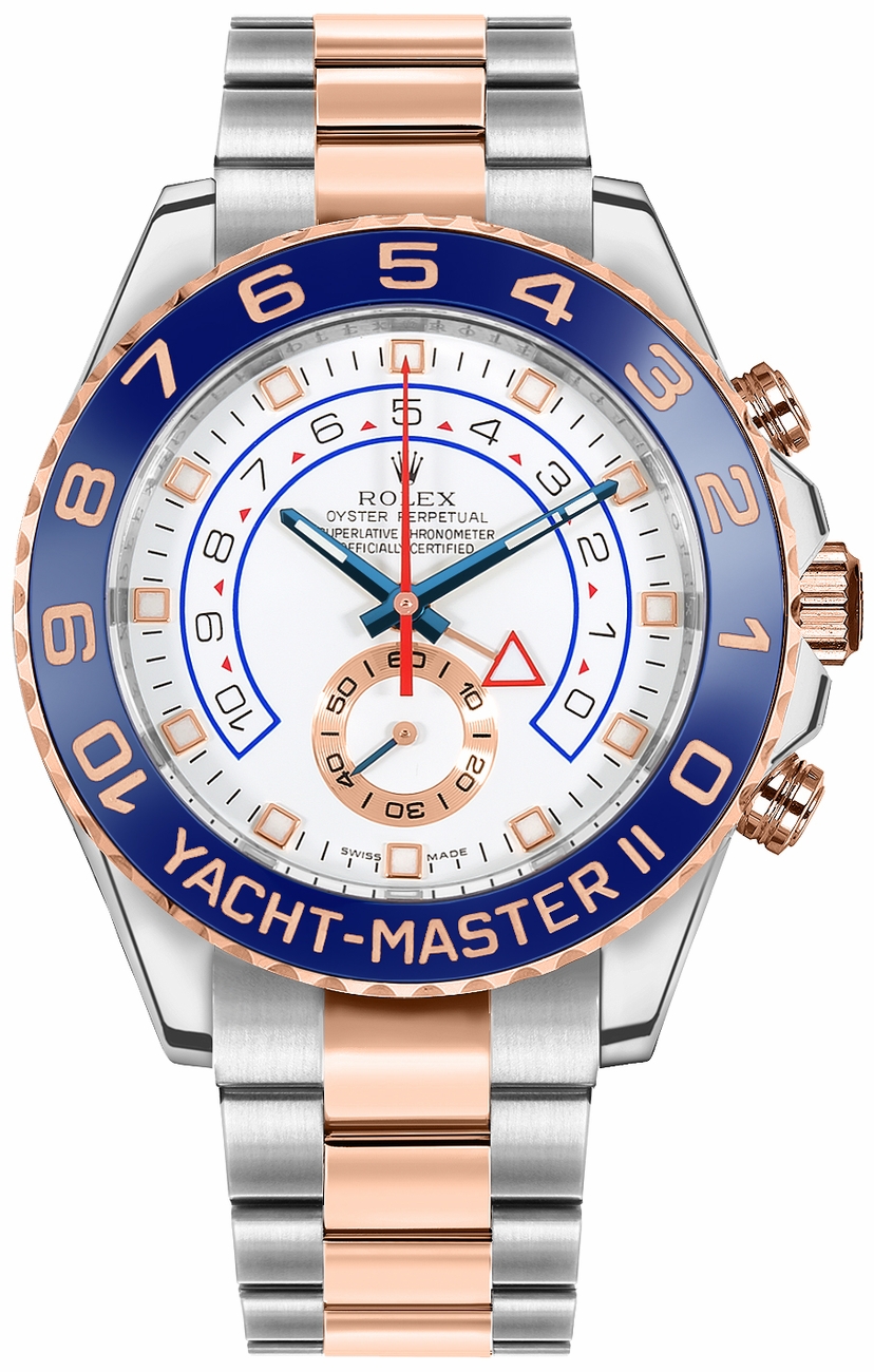 The Yacht-Master II is equipped with a new dial, and new hands that are characteristic of Rolex Professional models, enhancing legibility and sharpening its aesthetic appeal. The dial now features a triangular hour marker at 12 o’clock and a rectangular hour marker at 6 o’clock for more intuitive reading of the watch.