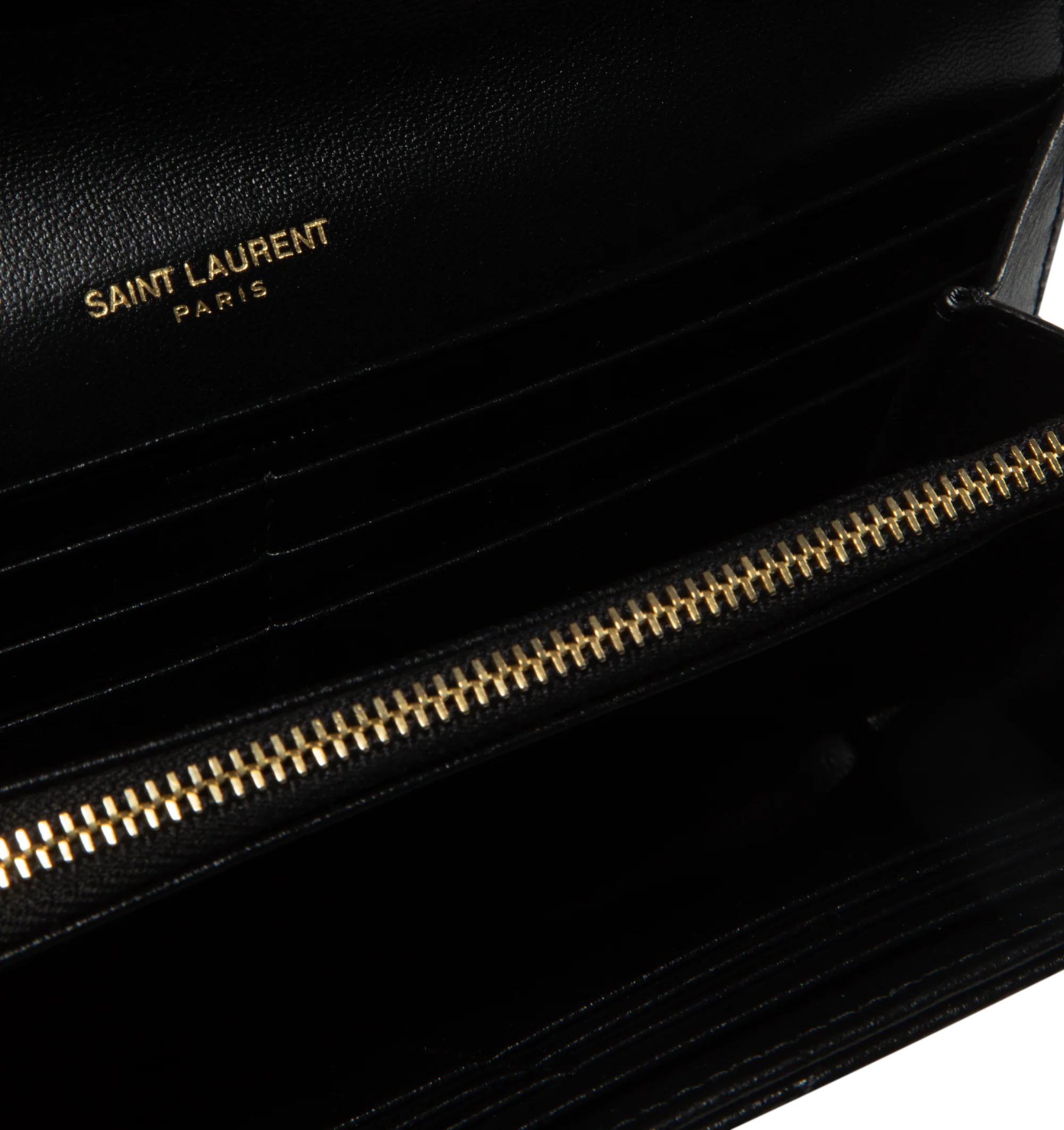 SAINT LAURENT Large Flap Wallet featuring quilted overstitching, leather lining, snap button closure, twelve card slots, one coin pocket, two bill compartments and two receipt compartments. 7.5" X 4.3" X 1.2". 100% lambskin.