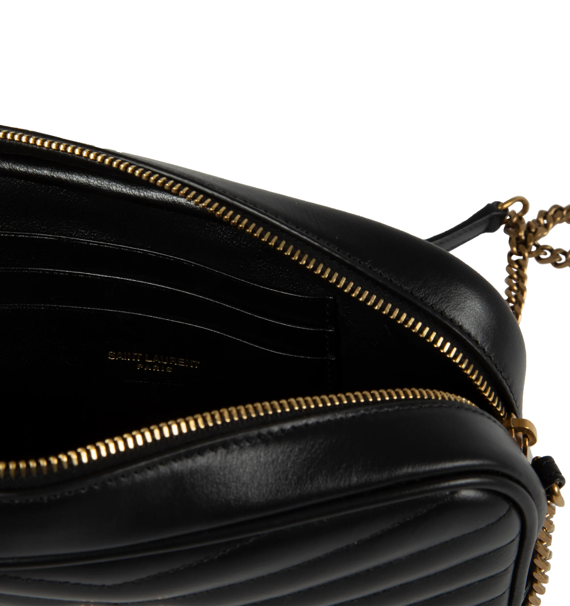 SAINT LAURENT Mini Lou with Chain featuring zip closure, back slip pocket, three card slots and leather lining. 7.5 X 4.1 X 2 inches. 100% calfskin.