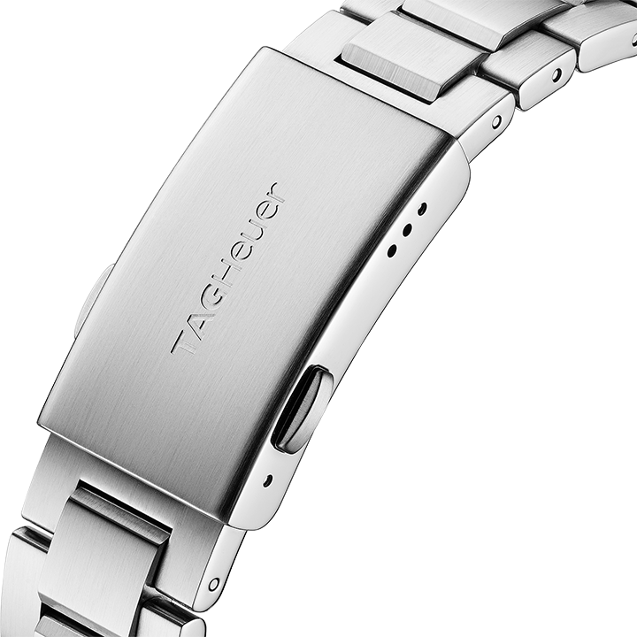 In three-row fine-brushed steel, with folding clasp and safety push buttons to prevent accidental opening, and an integrated diver extension that allows it to be worn over a wet suit for diving or surfing.