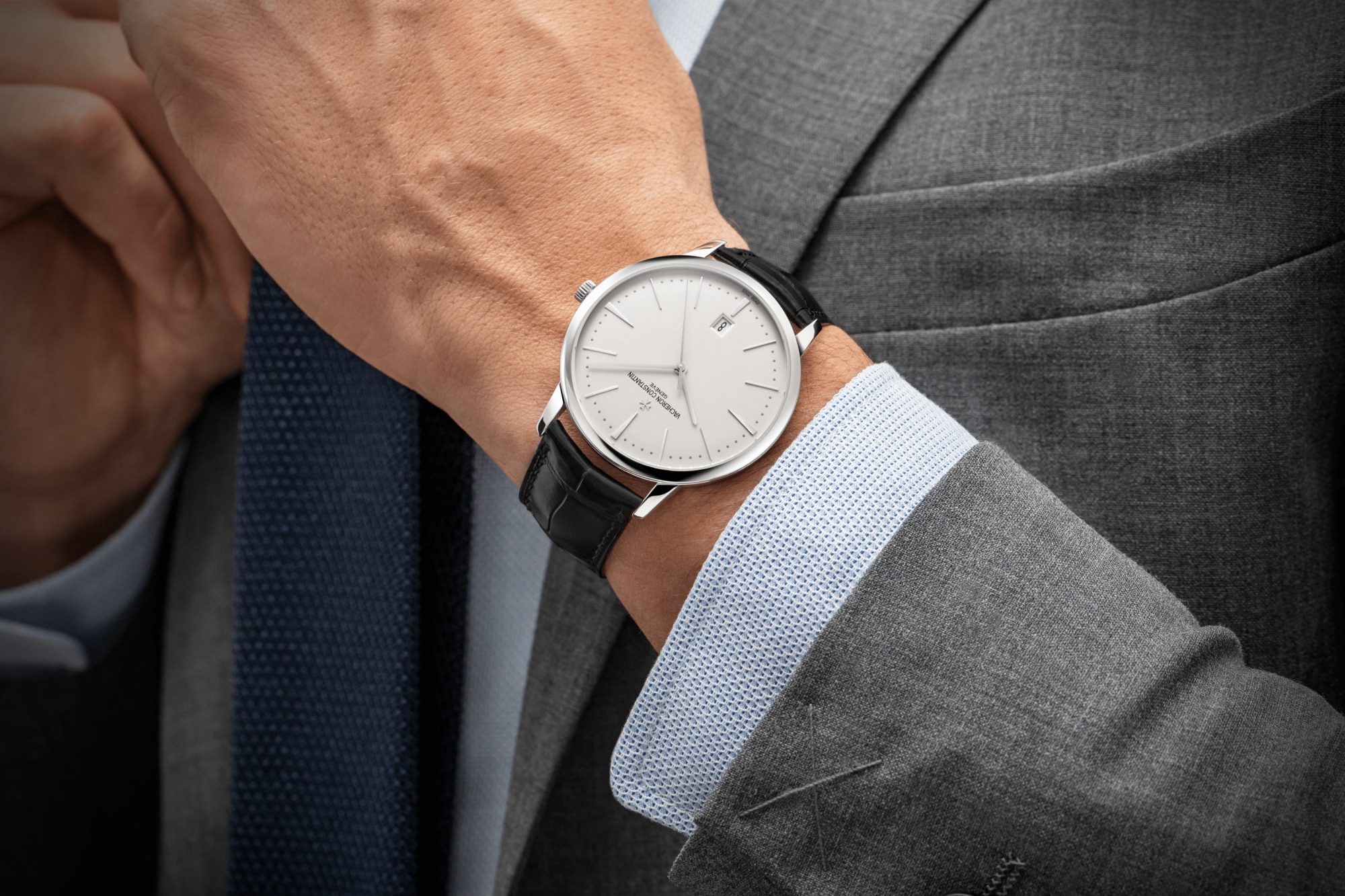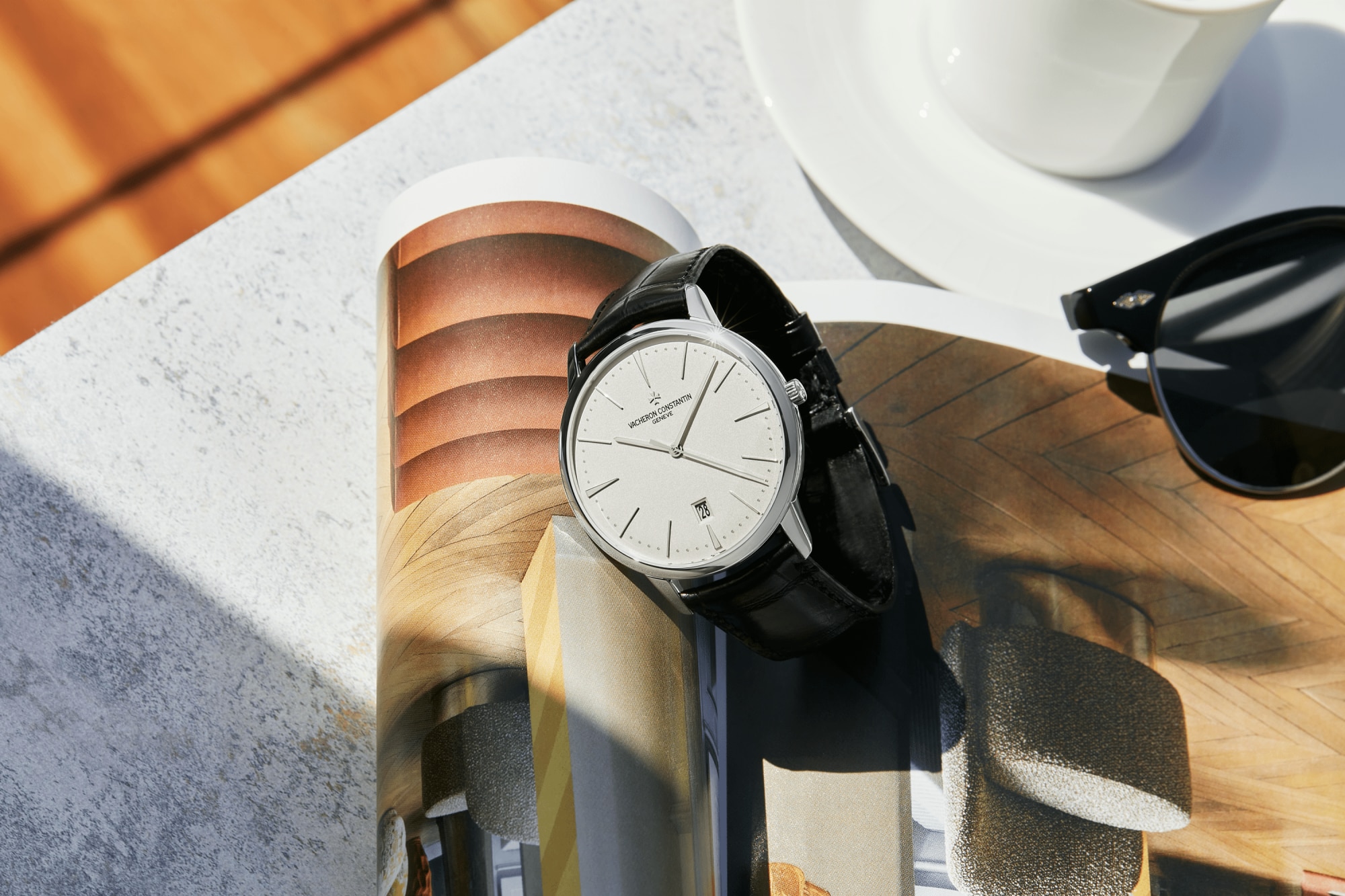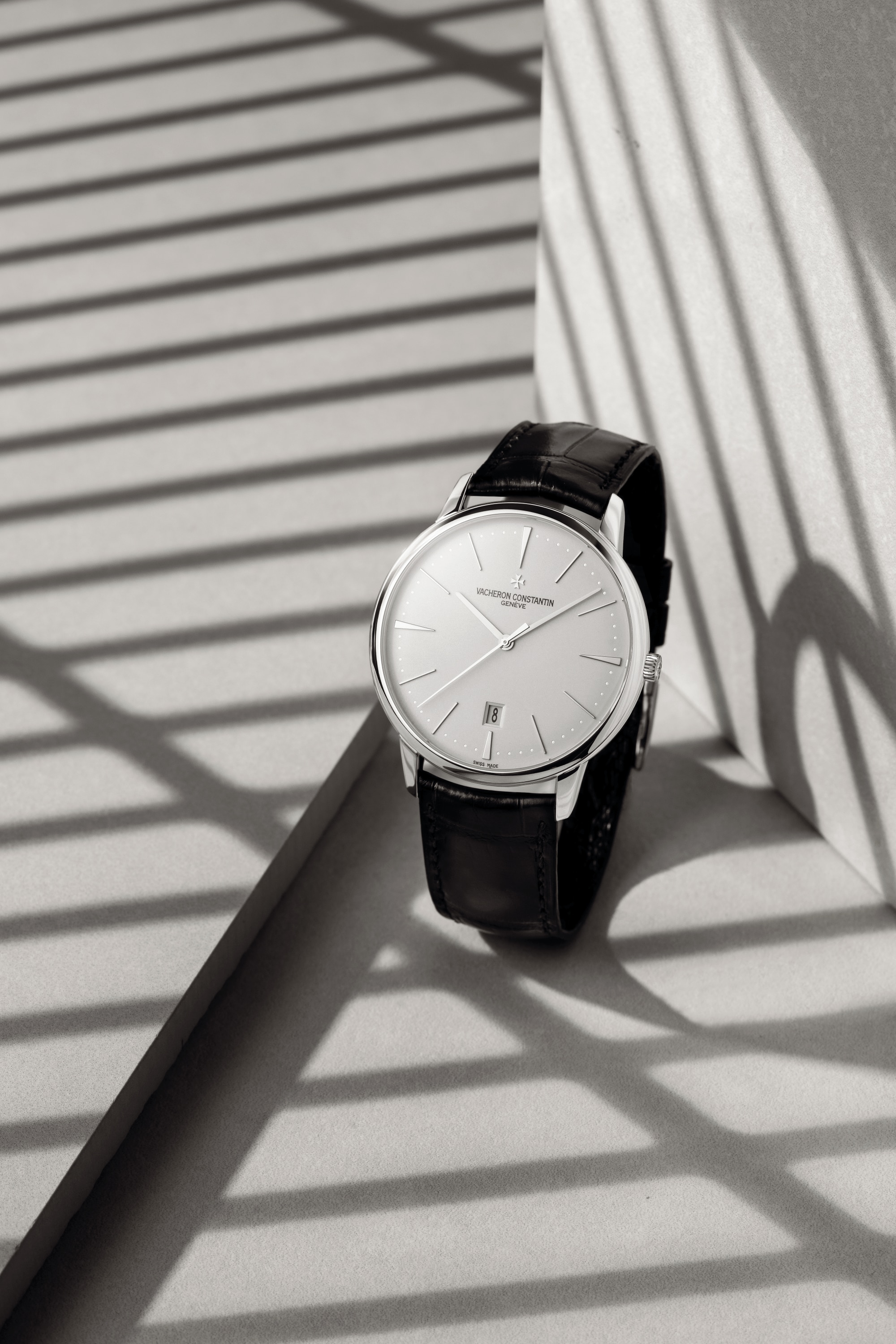 From the Patrimony Collection. Inspired by classic watches of the 1950s, this elegant timepiece boasts a round 18K white gold case, silvered dial and date display at 6 o'clock.