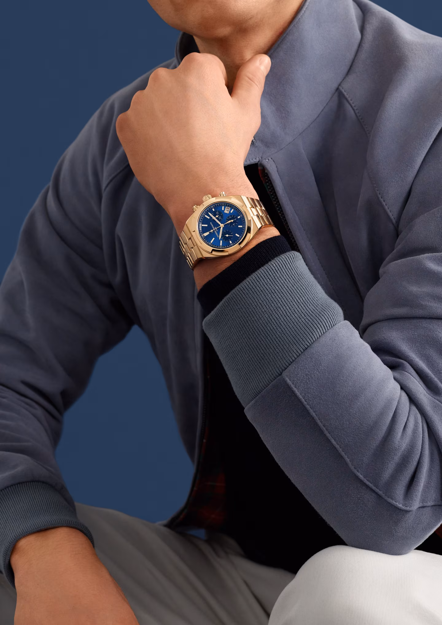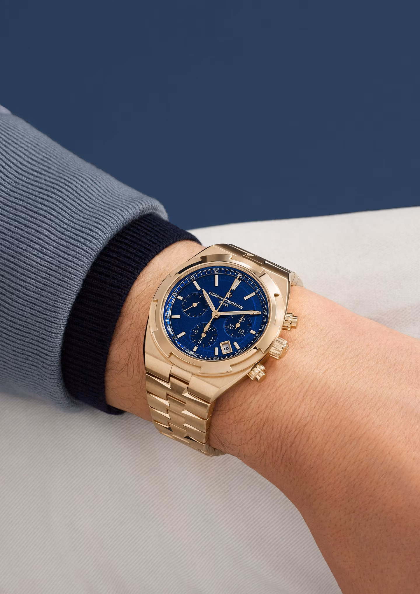 Elegant yet casual, this 18K 5N pink gold watch houses a column-wheel chronograph enhanced by a date aperture between 4 and 5 o’clock. Its openworked caseback reveals an oscillating weight in 22K gold featuring decoration inspired by the wind rose, a tribute to the spirit of travel. Thanks to its clasp and system of three easily interchangeable straps – leather, rubber and 18K 5N pink gold – the watch can be personalized according to the owner’s wishes. Through its links, the bracelet subtly reveals the Maltese cross, a Vacheron Constantin icon.