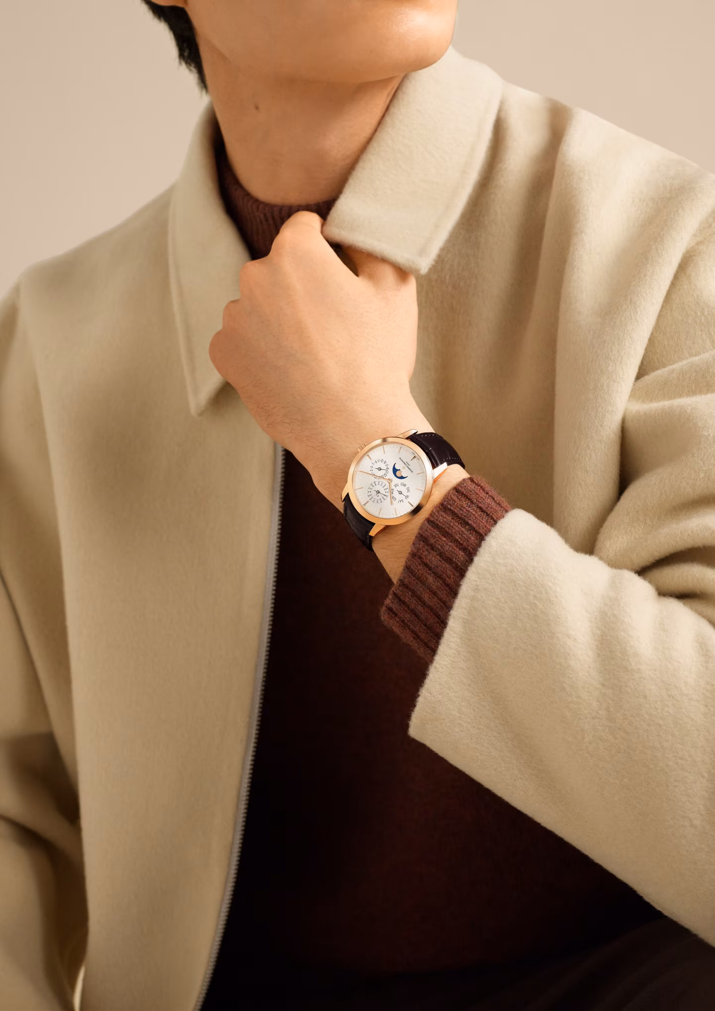 An elegant interpretation of the perpetual calendar, this 18K pink gold watch houses an ultra-slim automatic movement, just 4.05 millimeters thick, which will keep perfect time until 2100. The moon phase features a star-studded sky and two gold moons. Its openworked caseback reveals the exceptional hand-finished details of the self-winding mechanical movement.
