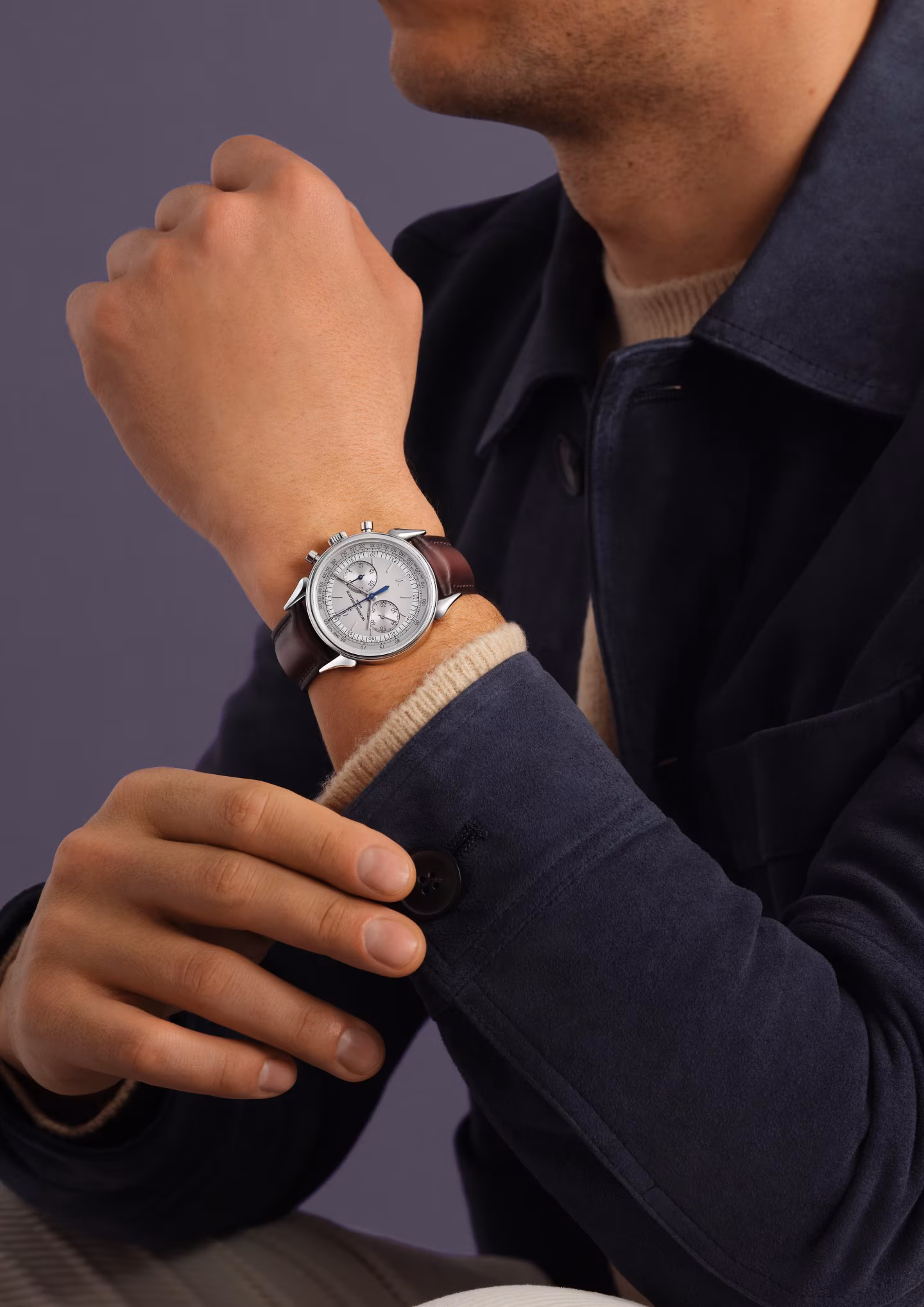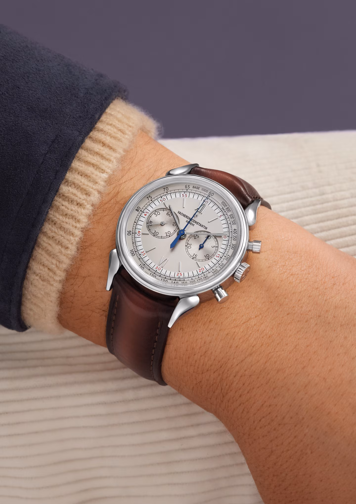 This watch in steel pays tribute to the legendary and assertive “cow horns” that adorned the 1955 manual-winding chronograph, reference 6087, the first water-resistant chronograph manufactured by Vacheron Constantin. Painted on the dial, the tachymeter scale makes it possible to determine an average speed thanks to the central hand of the chronograph. Rare and authentic, its calfskin-leather strap was developed by Serapian, a Maison from Milan dear to Vacheron Constantin.